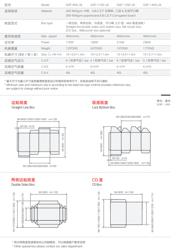 GSF-850/1100 LB卡紙 · 瓦楞鎖底糊盒機技術(shù)參數(shù)及制作尺寸: